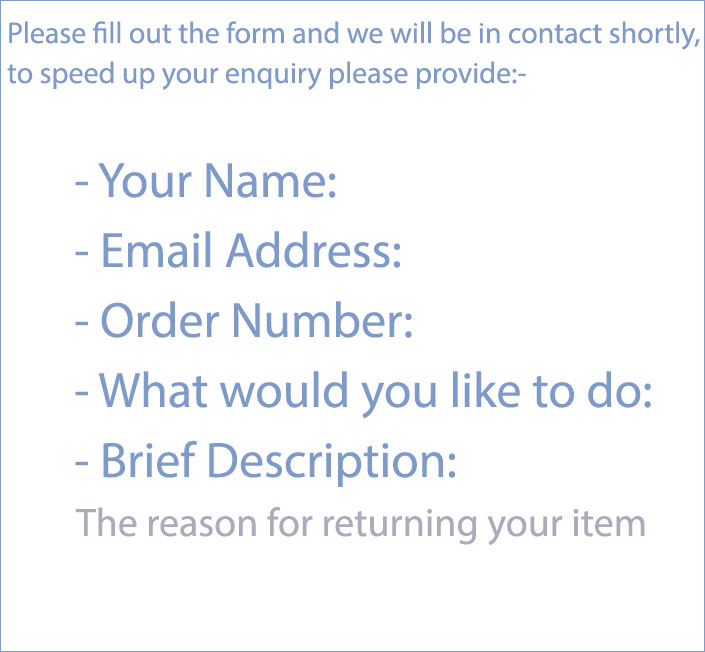 We can only accept returns for refunding or replacing if the original item(s) were defected upon delivery and or wrong size ordered. We can only accept return(s) if in original packaging, non damaged and mark free.